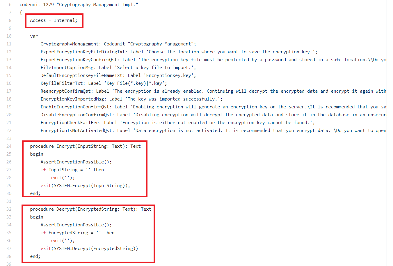 The details of each functionality are defined in a separate codeunit, called Cryptography Management Impl. This codeunit contains all the internal implementation for each functionality and it’s defined as Access = Internal: